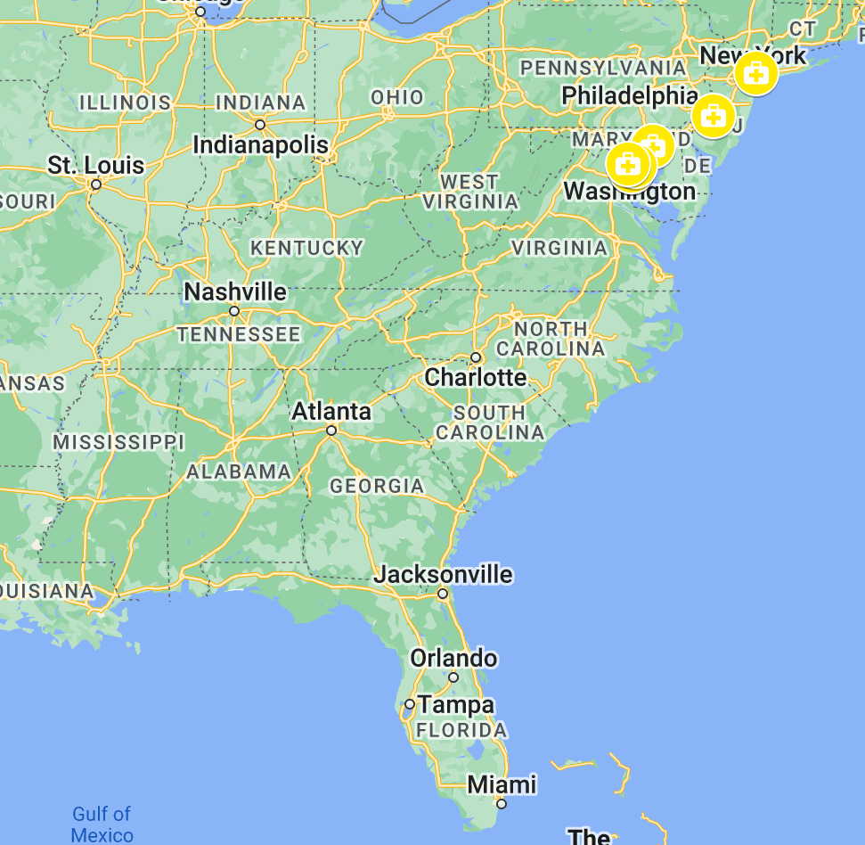 Clinics that are also a 2-3 hour (direct) flight from Tampa & can provide additional funding assistance and/or practical support. These clinics are labelled with a yellow icon in the map above.